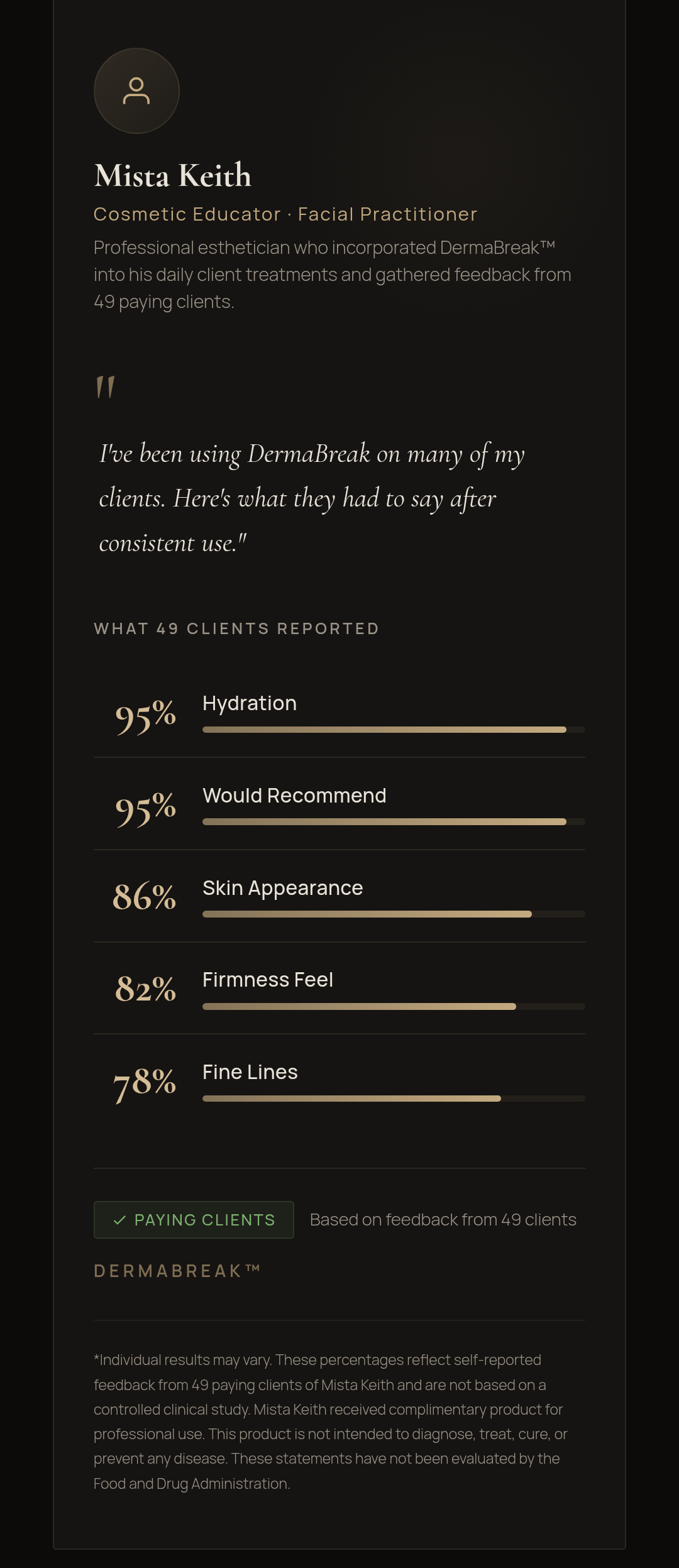 DermaBreak is a cosmetic wellness product designed to improve the appearance of skin. It is not intended to diagnose, treat, cure, or prevent any medical condition.